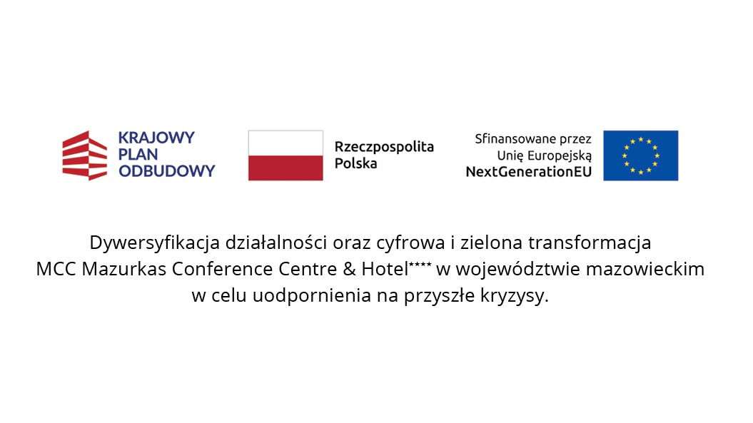 Firma MCC Mazurkas Conference Centre & Hotel Sp. z o.o. uzyskała dofinansowanie z Krajowego Planu Odbudowy (KPO) w ramach projektu dywersyfikacji działalności oraz cyfrowej i zielonej transformacji w celu uodpornienia na przyszłe kryzysy.
